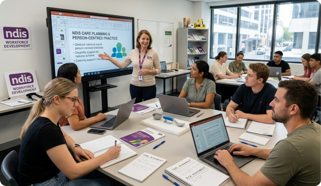 Training related to the National Disability Insurance Scheme (NDIS) and Registered Training Organisations (RTOs) focuses on preparing individuals to work within Australia’s disability support sector. These learning programs provide the skills, knowledge, and practical understanding required to deliver professional and person-centred disability services.